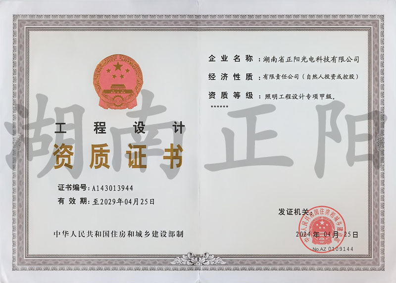 湖南省正陽光電科技有限公司是一家從事亮化工程及大型燈光藝術的設計、制作、安裝和維護于一體的專業化公司。公司資質齊全、管理嚴謹、技術先進、實力雄厚,取得了城市及道路照明工程專業承包壹級資質、照明工程設計專項甲級資質、國家高新技術企業、國家“重質量·守誠信”示范企業。